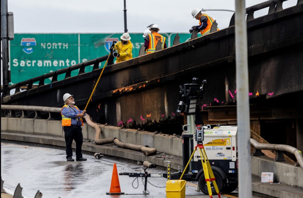 While investigators have not said how the fire was set, the blaze was fed by pallets, cars, construction materials, hand sanitizer and other items being stored under the freeway under a little-known program that now is under scrutiny. Newsom has said the state will reassess the practice of leasing land under roads to bring in money for mass transportation projects.